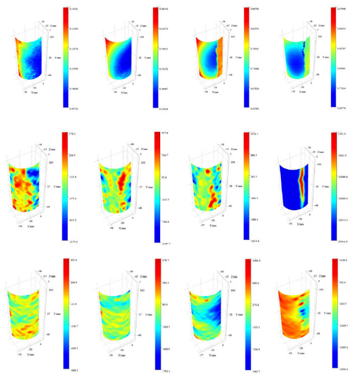 As shown in Figure 2, during the initial loading stages—including the crack closure stage and the linear elastic stage—the displacement field remained uniform and the strain field showed no abnormal concentration. This indicates that internal microcracks had not yet propagated.